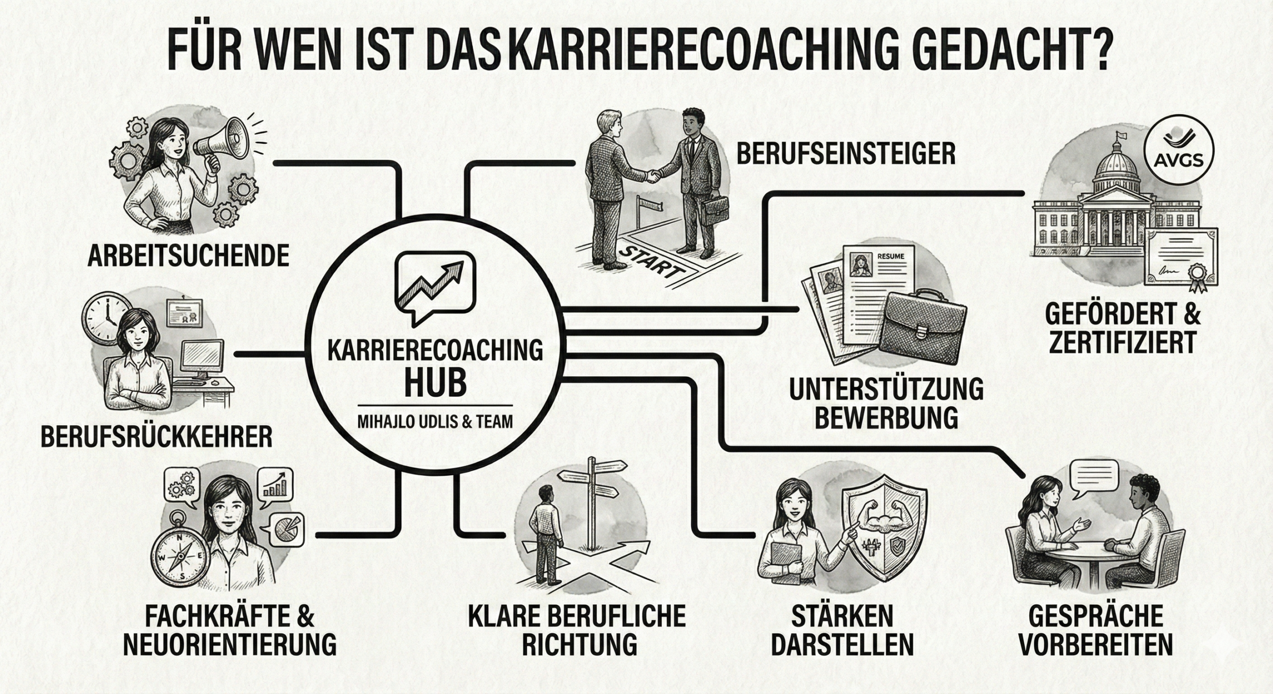 Als Karrierecoach und Business-Experte begleitet Mihajlo Udlis gemeinsam mit seinem Team Menschen dabei, ihre berufliche Zukunft neu auszurichten, zu stärken und gezielt zu gestalten. Das individuelle Karrierecoaching ist eine AZAV-zertifizierte Maßnahme (100 UE) und richtet sich an Personen, die ihre Chancen auf dem Arbeitsmarkt deutlich verbessern oder einen klaren nächsten beruflichen Schritt gehen möchten.